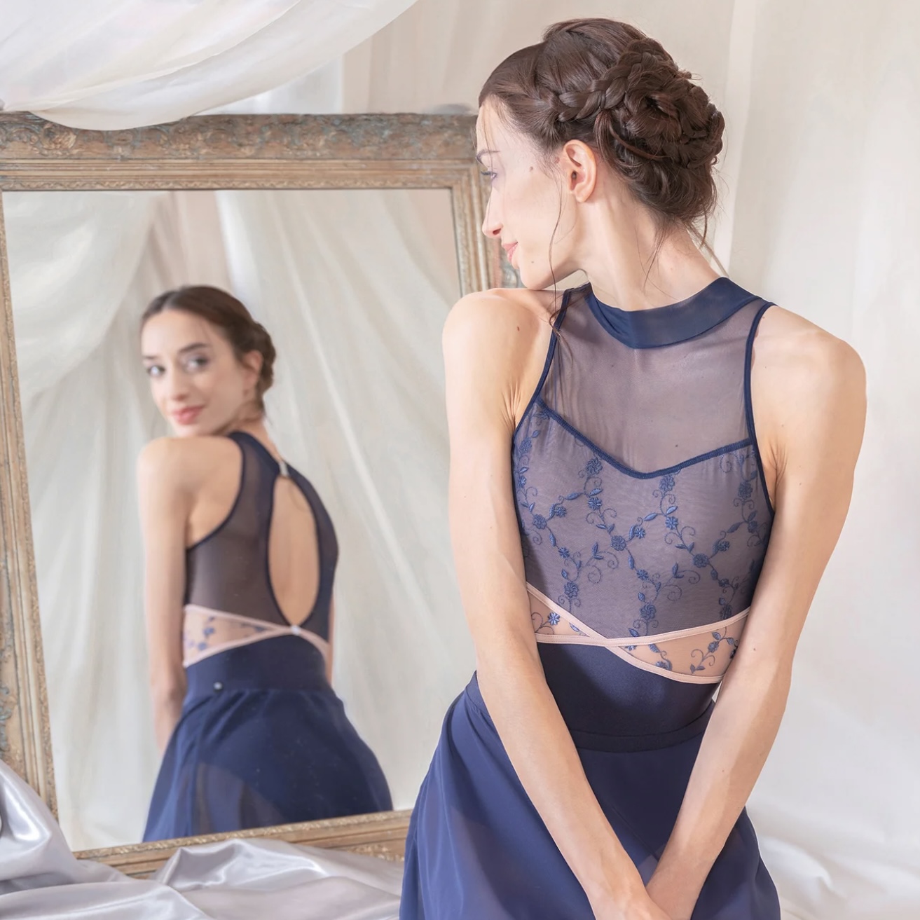 刺繍チュールがさりげなく覗くことで、ウエストラインを軽やかかつ精巧に引き立てる控えめな装飾性を添えています。
