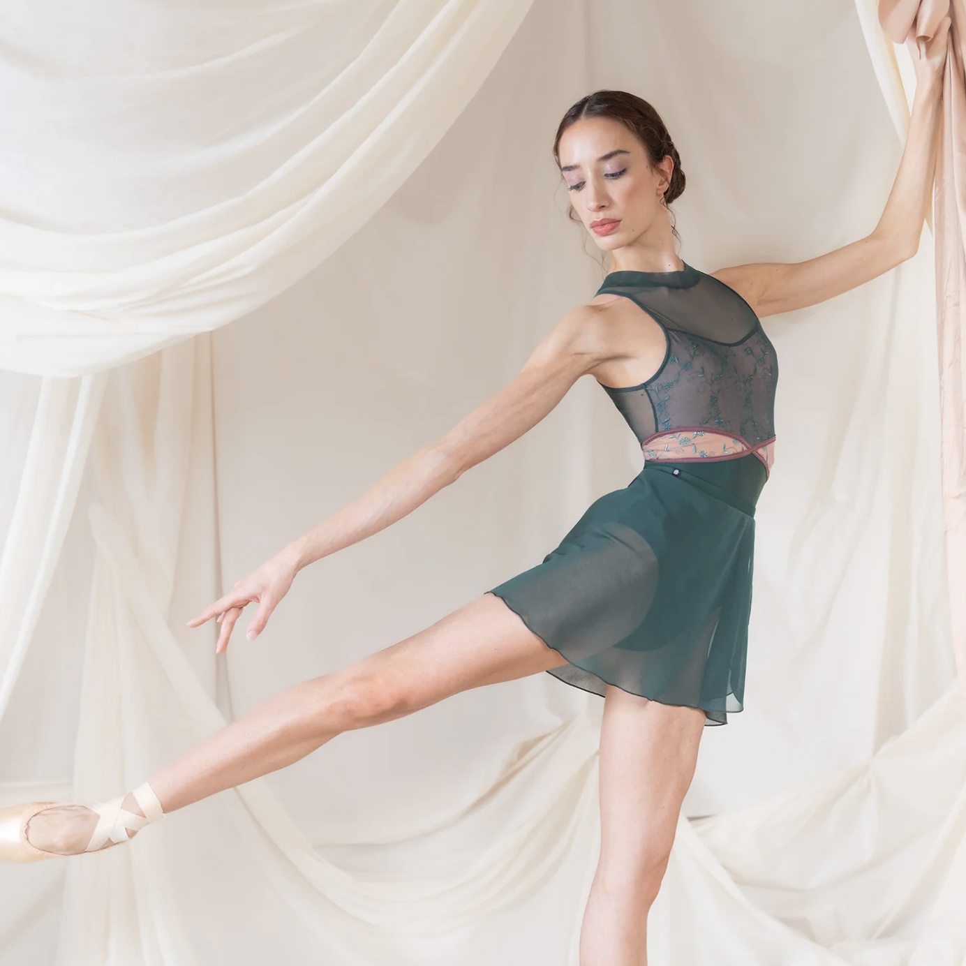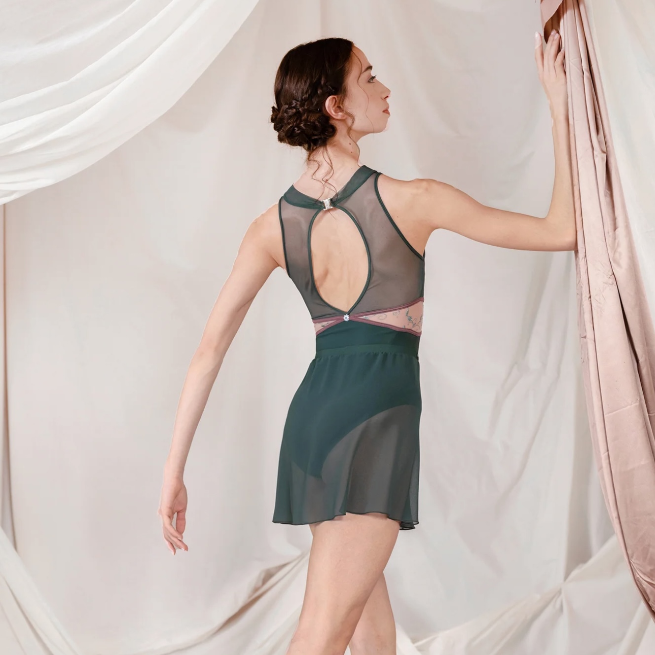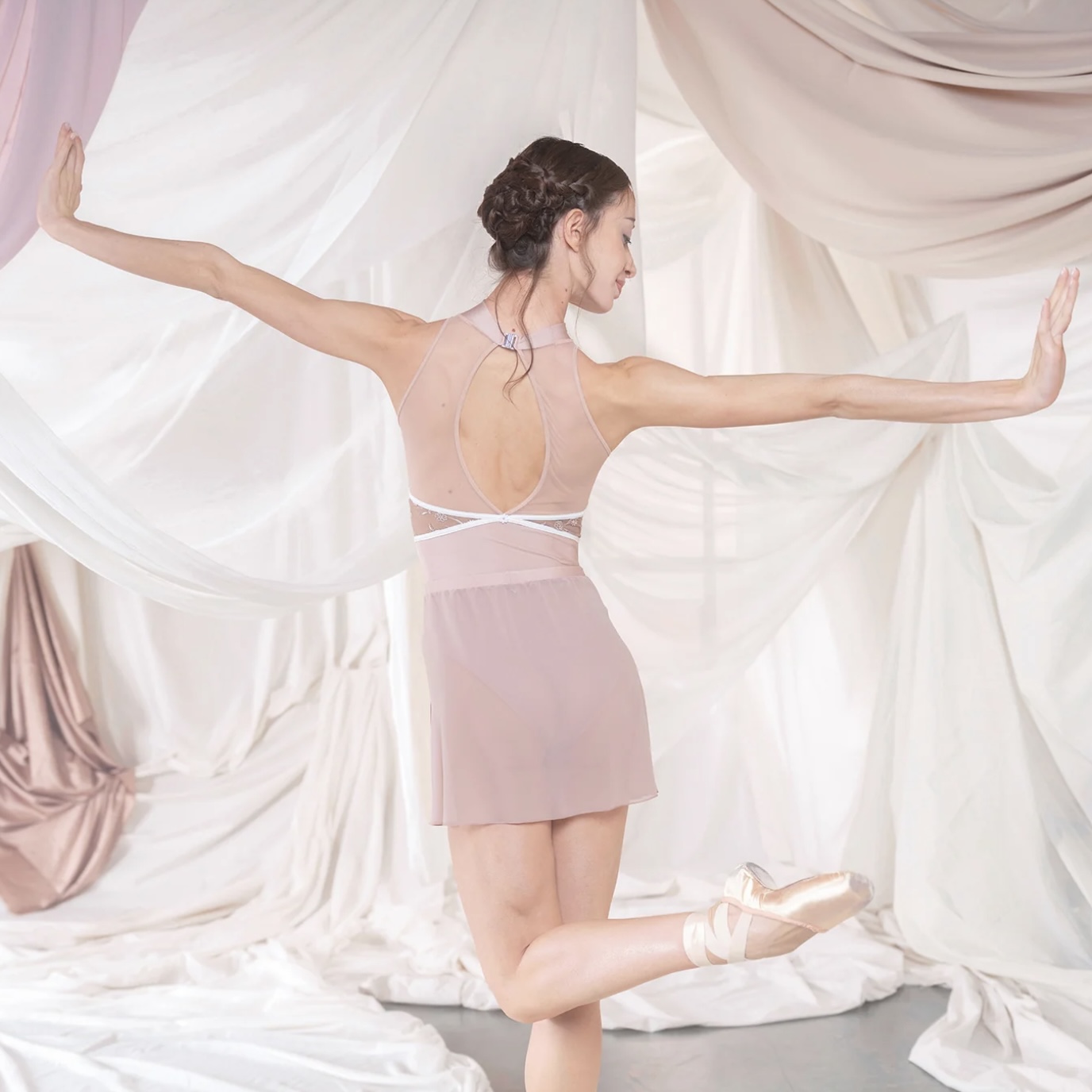 Pandia CL バレエレオタードは、建築的なラインと繊細な透明感が際立つ、洗練されたノースリーブデザインの一着です。