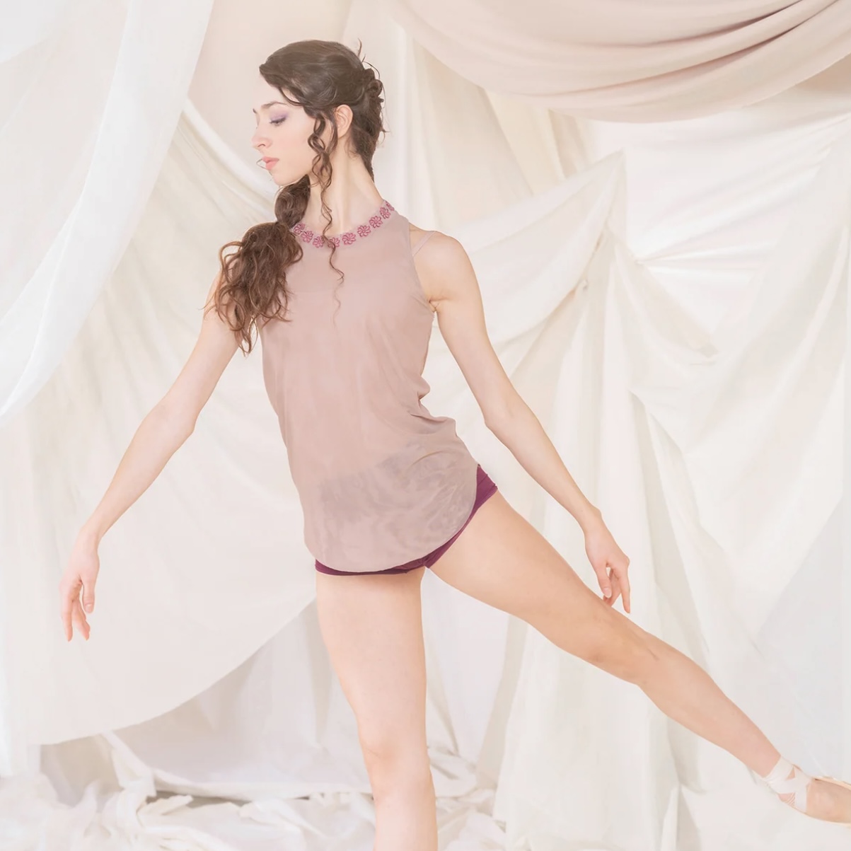 上質な透け感と美しいラインがレオタードとのレイヤリングを引き立て、